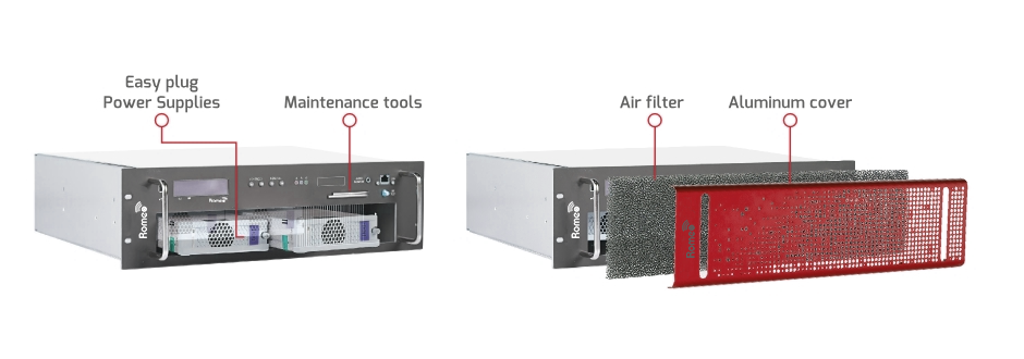 In case of a power supply failure, you don’t need to waste your time disassembling the unit. You can pull out the damaged PSU from the front panel in just few seconds, with no need to turn off the transmitter.